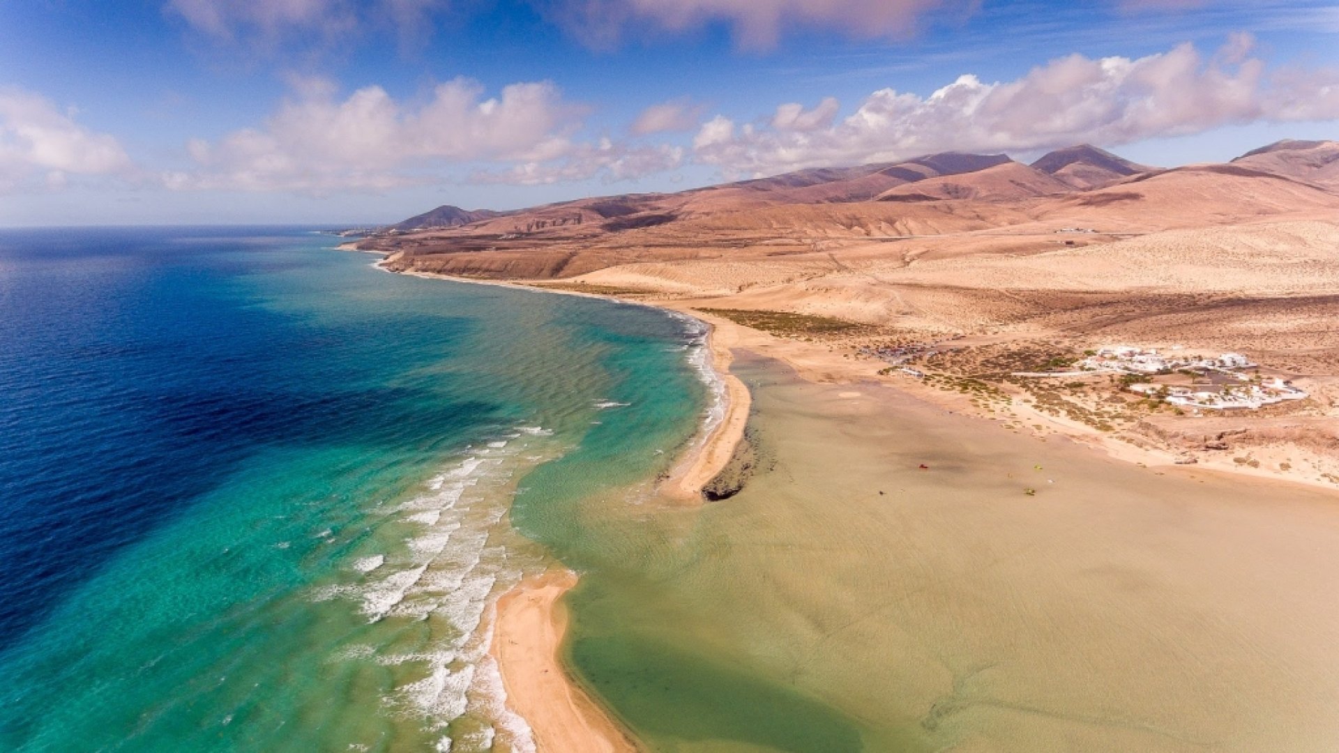 Playa de la Barca, also known as Sotavento Beach, is a stunning paradise located in Fuerteventura, Spain. This expansive beach stretches for nine kilometers, featuring fine golden sand and crystal-clear turquoise waters. Visitors have described it as 'one of the most beautiful beaches' they have ever encountered, offering a unique landscape with its natural lagoons that form during low tide.