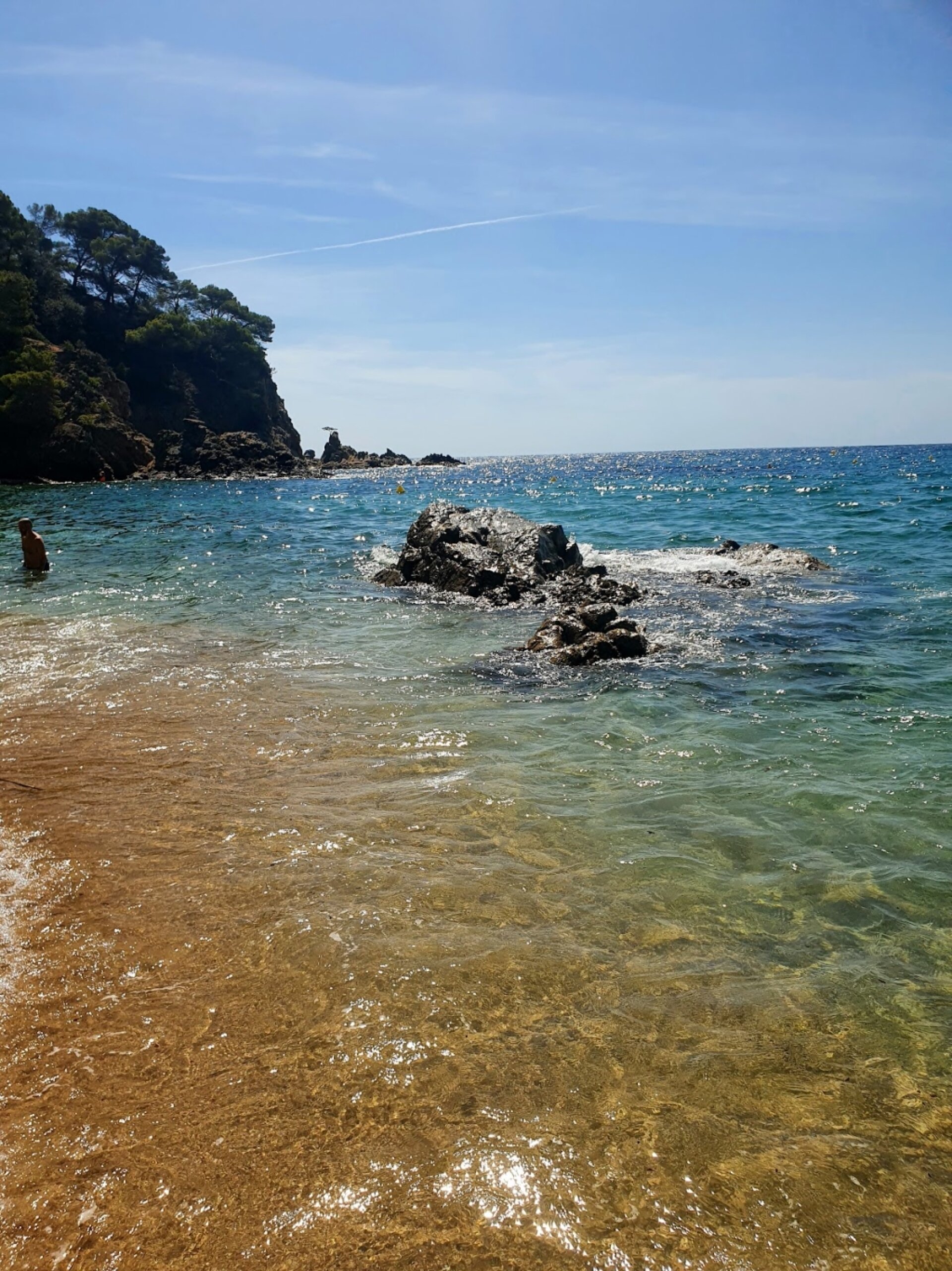 Experiencia fantástica: De las playas más bonitas que he conocido en la costa brava. Está dividida por rocas que hacen dos playas y una más pequeña como una especie de calita. Con un agua mansa, cristalina y con una temperatura perfecta para disfrutar un baño en medio del calor que aprieta en el mar. Es bastante concurrida, sugiero ir a primera hora o por el contrario en el relevo del mediodía (ya que mucha gente se va para la hora de la comida); de esta forma quizás encuentres con más facilidad donde aparcar. Hay un parking pequeño en la entrada de la playa (no más de 20 coches) y luego conforme te vas alejando encuentras otros parkings, todos igual de concurridos. Hay gente que al final aparca en las curvas de bajada a la playa (también es posible). Hay un par de restaurantes en la entrada de la playa y hacia el final hay un chiringuito que ofrece comida básica, no es de la mejor calidad pero te salva con cosas que puedas necesitar estando en medio de la nada:patatas bravas, calamares, hamburguesas, bebidas fresquitas. También hay servicio de alquiler de kayak y padel en el lado del muelle. Hay embarcaciones que traen y recogen personas cada cierto tiempo.