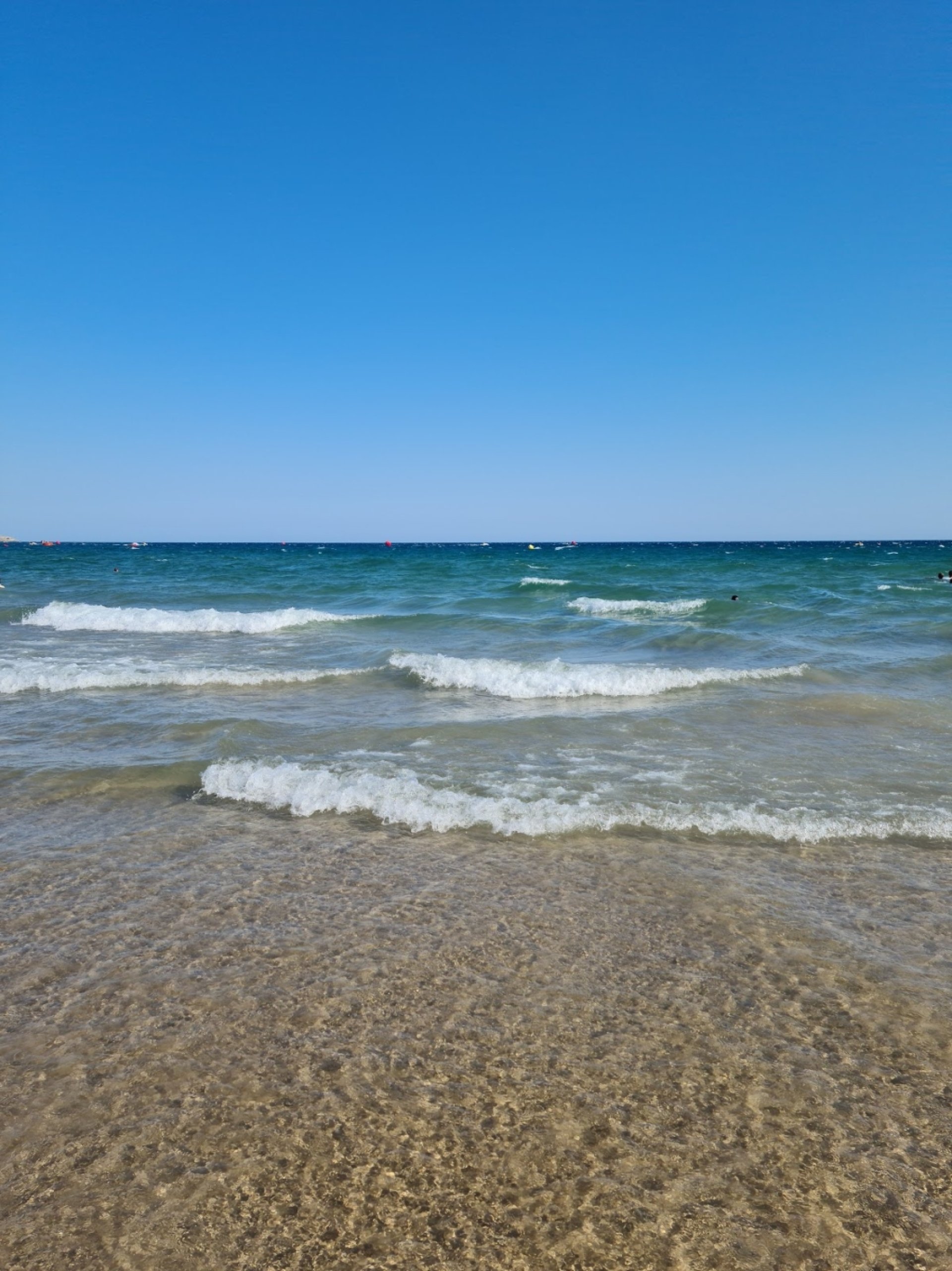 Experiencia fantástica: Playa hermosa. Por la mañana, el mar está más o menos tranquilo. Por la tarde ya hay olas. La arena es agradable, en la playa hay un bar y ducha, lo que es muy conveniente. Además, si compras una tumbona por 1 día (precio: 10€), recibirás una cerveza en el bar gratis. La cerveza es buena. El único inconveniente es que el domingo y lunes el agua estaba sucia por alguna razón. No fue agradable. Pero en los demás días de la semana estaba limpio.