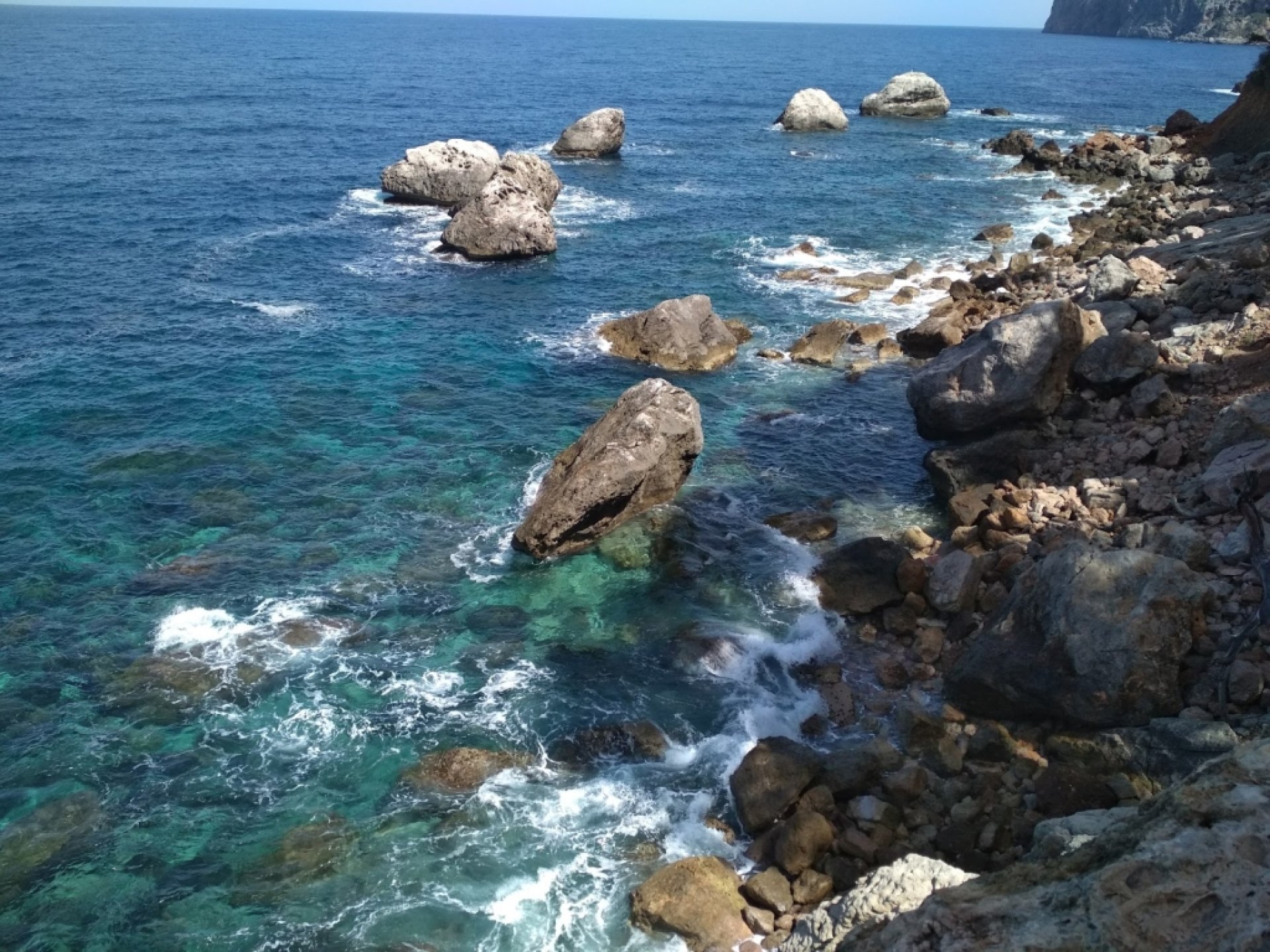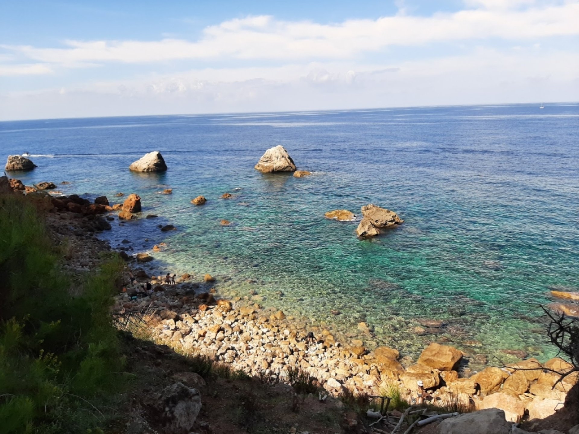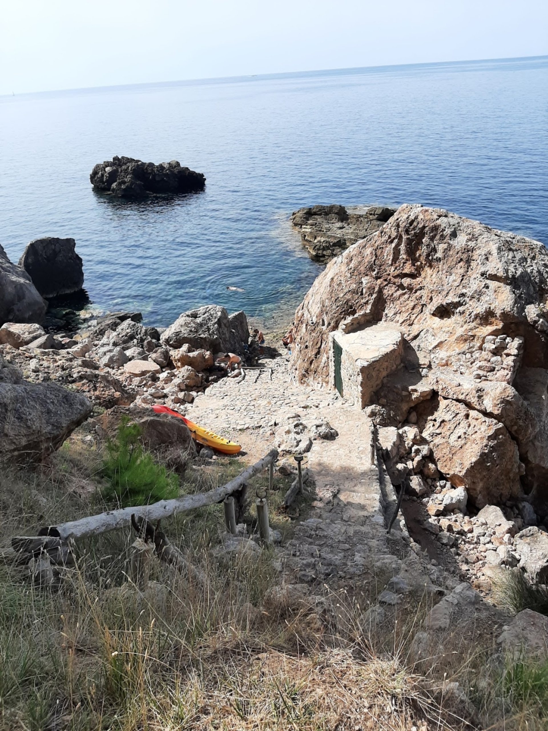 Experiencia fantástica: Sollerで滞在中にきれいな海に行きたくてこの海より少し先のCala deia に向かってレンタル自転車で約1時間半上りLlucalcariのバス停に到着。海に行けるの?と2人の少年に尋ねたら自転車では無理だけどね!と教えてもらい、バス停から100m先の駐車スペースに自転車止めて、そこからは徒歩で約15分。アプローチが大変なので人が少なくてビーチリゾートってかけらもありません。隠れビーチ的な場所が好き、混んでない海が好き、砂浜嫌いって方におすすめです。 以下はここで楽しむ為に是非参考に。 *駐車スペースは5、6台です。車で行く場合は運に任せましょう。 *スニーカー必須。海まで結構下ります、そして帰りは上ります。 *湧水あるのでシャワー代わりになります。そこに粘土の泥があり身体に塗ってみると良いみたい(名物) *お水や食べ物は道中やここでは買えません。街で買って行きましょう。 *岩場オンリーですが平らな岩場もあるのでOK。 *今日は晴天でベタなぎで海もきれいで透明度80点! しあわせで心地よい時間をすごせました。