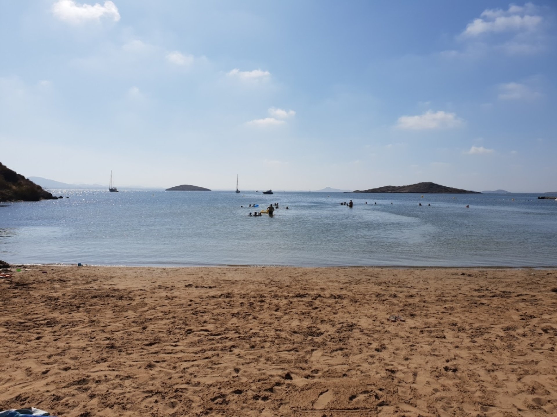 Experiencia fantástica: Un lugar tranquilo. Un poco apartado. Tiene un pinar que da bastante sombra y el agua es transparente. Puedes venir con niños porque apenas hay olas y después comer en alguno de los restaurantes cercanos. Cerca hay una isla que puedes llegar a ella caminando. Es una de las mejores playas del mar menor. Tiene puesto de socorrista y vestuarios para cambiarte con comodidad. También hay muchos perrotes y pepinos de mar. Pececitos de colores y algunas plantas en el fondo. Para bañarse y pasar el día está muy bien.