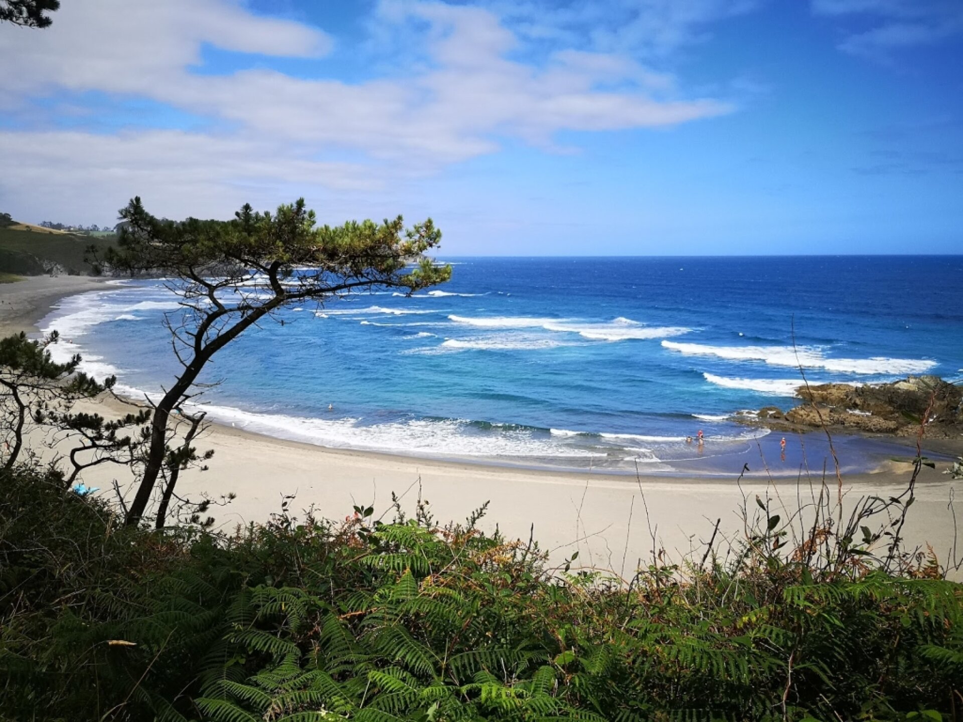 Experiencia fantástica: La playa es un paraje espectacular, con arena negra que contrasta con el verde de los eucaliptos que la rodean. Hay un chiringuito llamado 'Mar de fondo' situado en un punto elevado del bosque, desde donde se disfrutan de unas vistas preciosas a la playa, y que ofrece una cocina excelente. Además, la playa dispone de tres zonas de aparcamiento gratuito, aunque hay que tener en cuenta que el aparcamiento es limitado y el acceso desde el aparcamiento 1 implica bajar una pendiente (se hace en 2 minutos). Es un lugar perfecto para familias, con olas ideales para los principiantes del surf, y un entorno privilegiado con árboles altos y helechos. Sin embargo, es importante recordar que las autocaravanas no están permitidas en el aparcamiento, ni los perros en la playa. También hay rutas de senderismo cerca para aquellos que quieran explorar la naturaleza más allá de la playa.