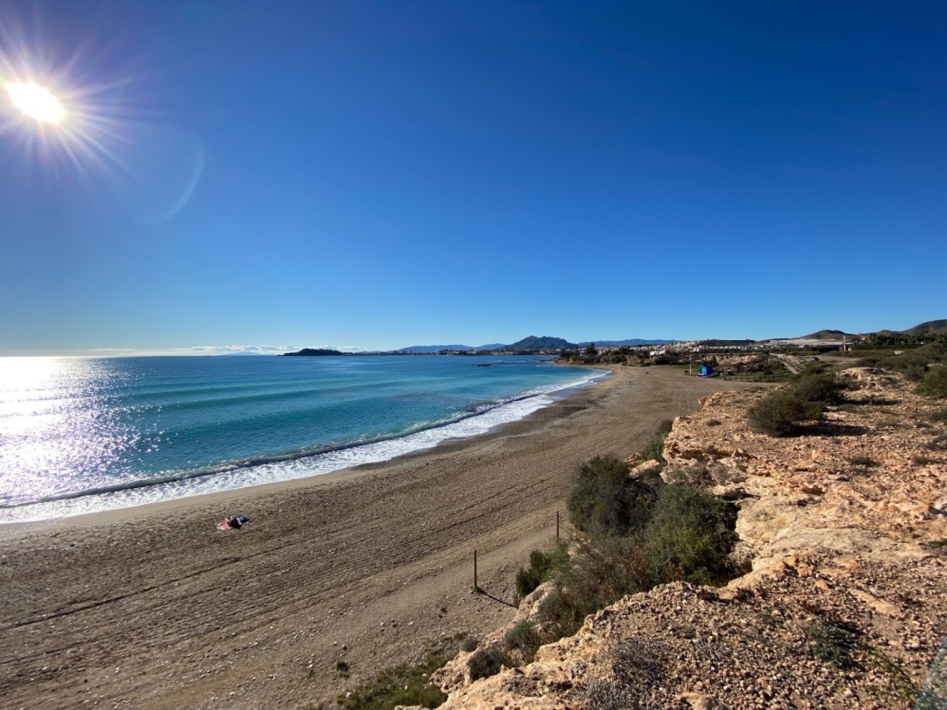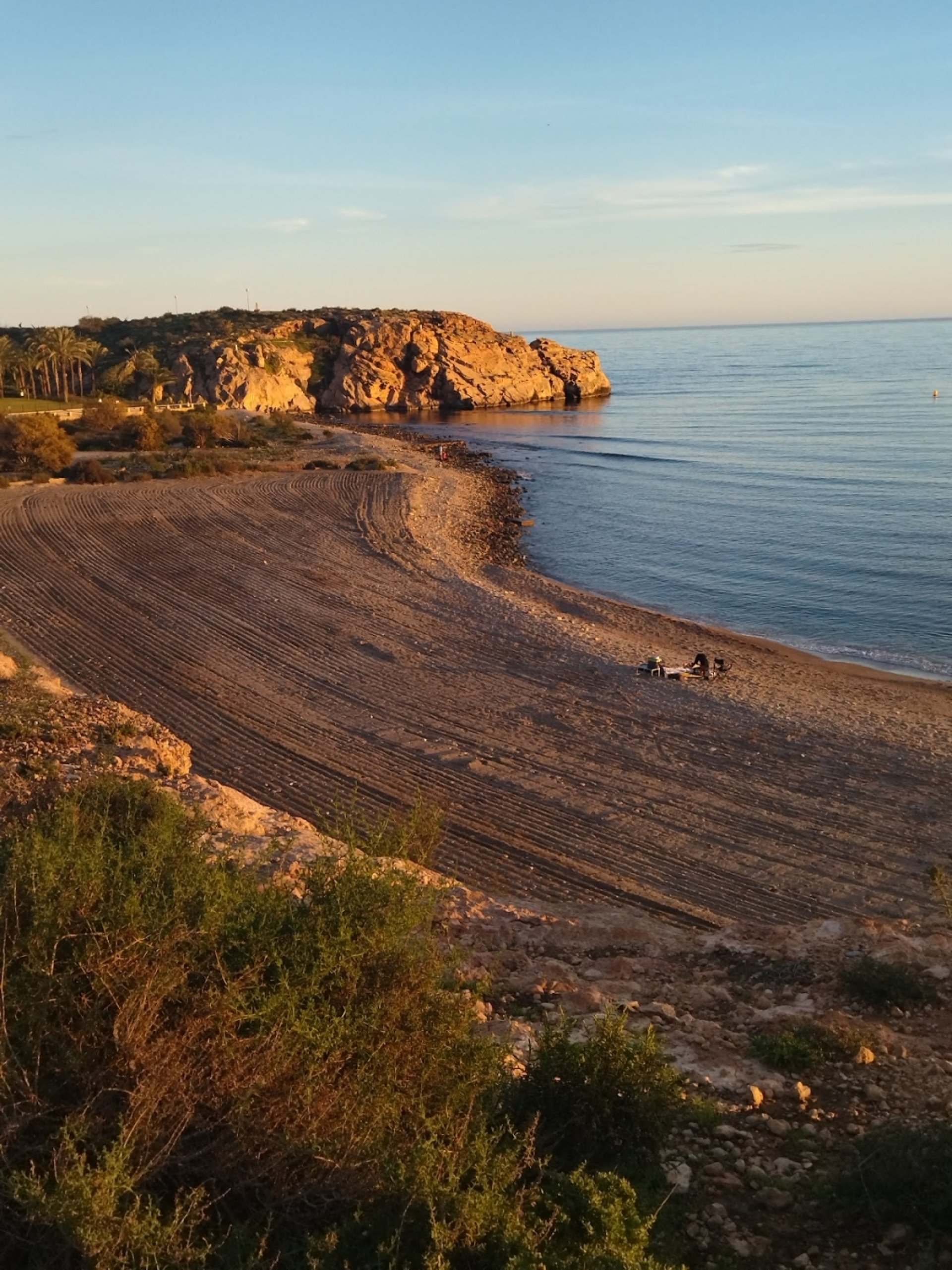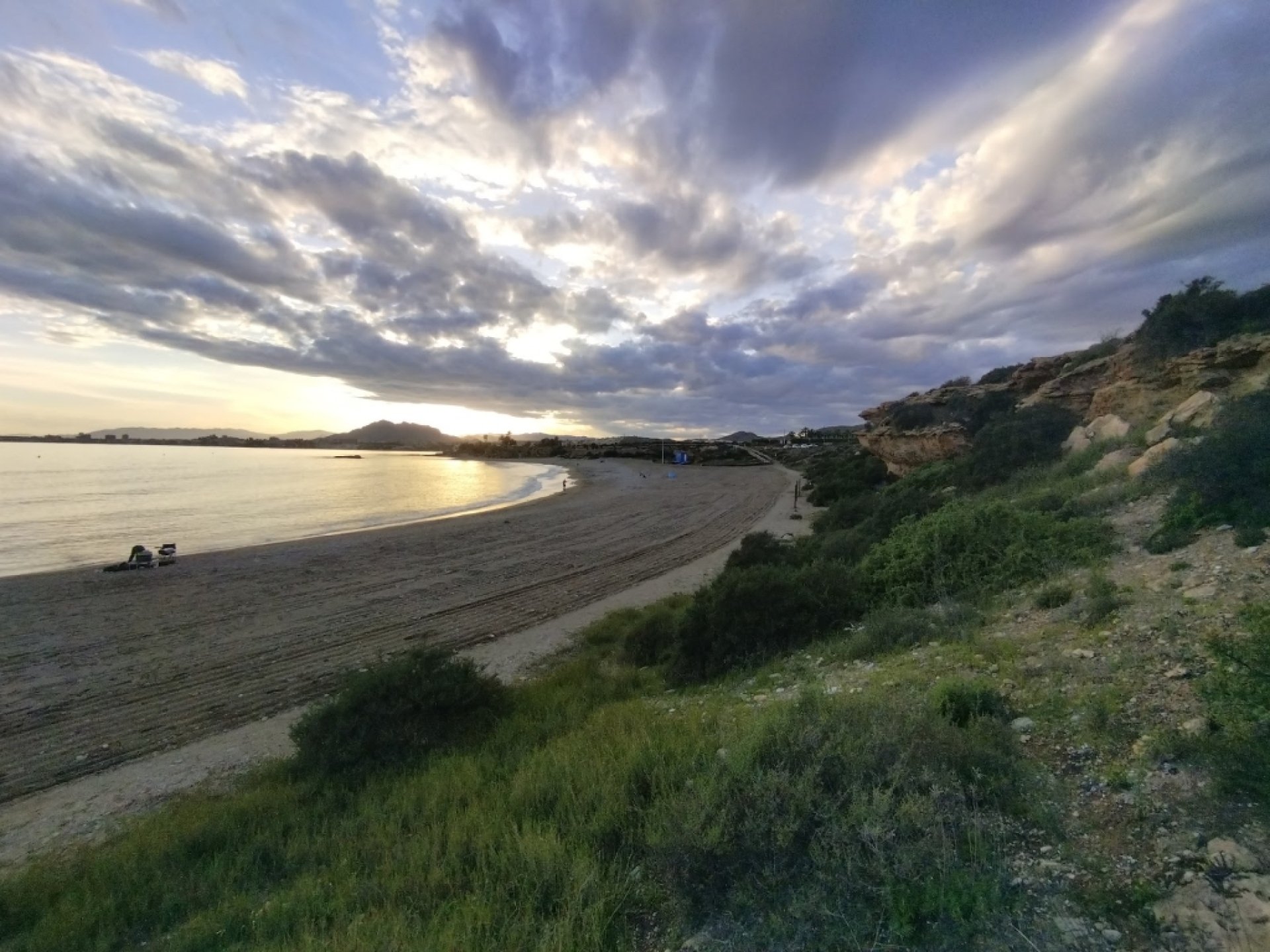 Experiencia positiva: Es una playa larga, con varios estacionamientos al lado de la carretera y con escaleras de madera para poder bajar. Cuenta con bandera azul. Fue un sábado con bastante viento, estuvimos poco tiempo. Había piedrecitas y algas debajo del agua, por lo menos en la parte primera que te encuentras si vienes desde Mazarrón. Con oleaje.